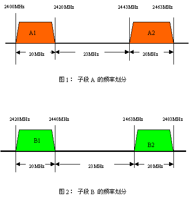 MegaLink扩频微波通信产品的射频单元的射频带宽固定为20MHZ。2.4GHz全频段可以分为子段A和子段B,中心频率间隔为43MHZ,子段A和子段B之间有23MHZ的间隔,如表所示,图1和图2给出了频率划分的示意图。