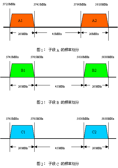 MegaLink扩频微波通信产品的射频单元的射频带宽固定为20MHZ。5.7GHz全频段可以分为子段A、子段B和子段C,中心频率间隔为63MHZ,子段A和子段B之间有43MHZ的间隔,如表所示,图1和图2给出了频率划分的示意图。